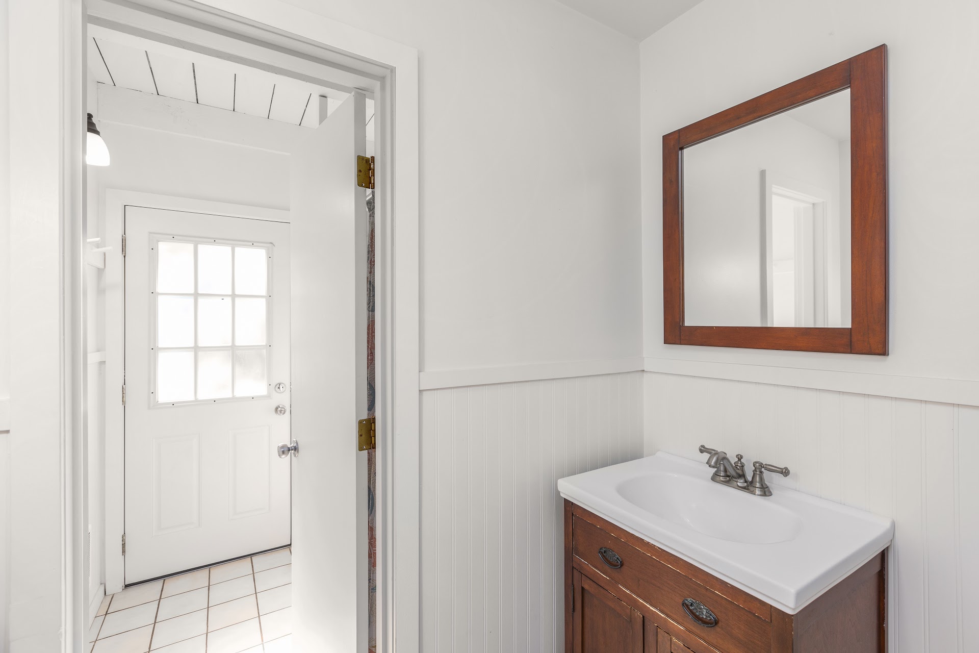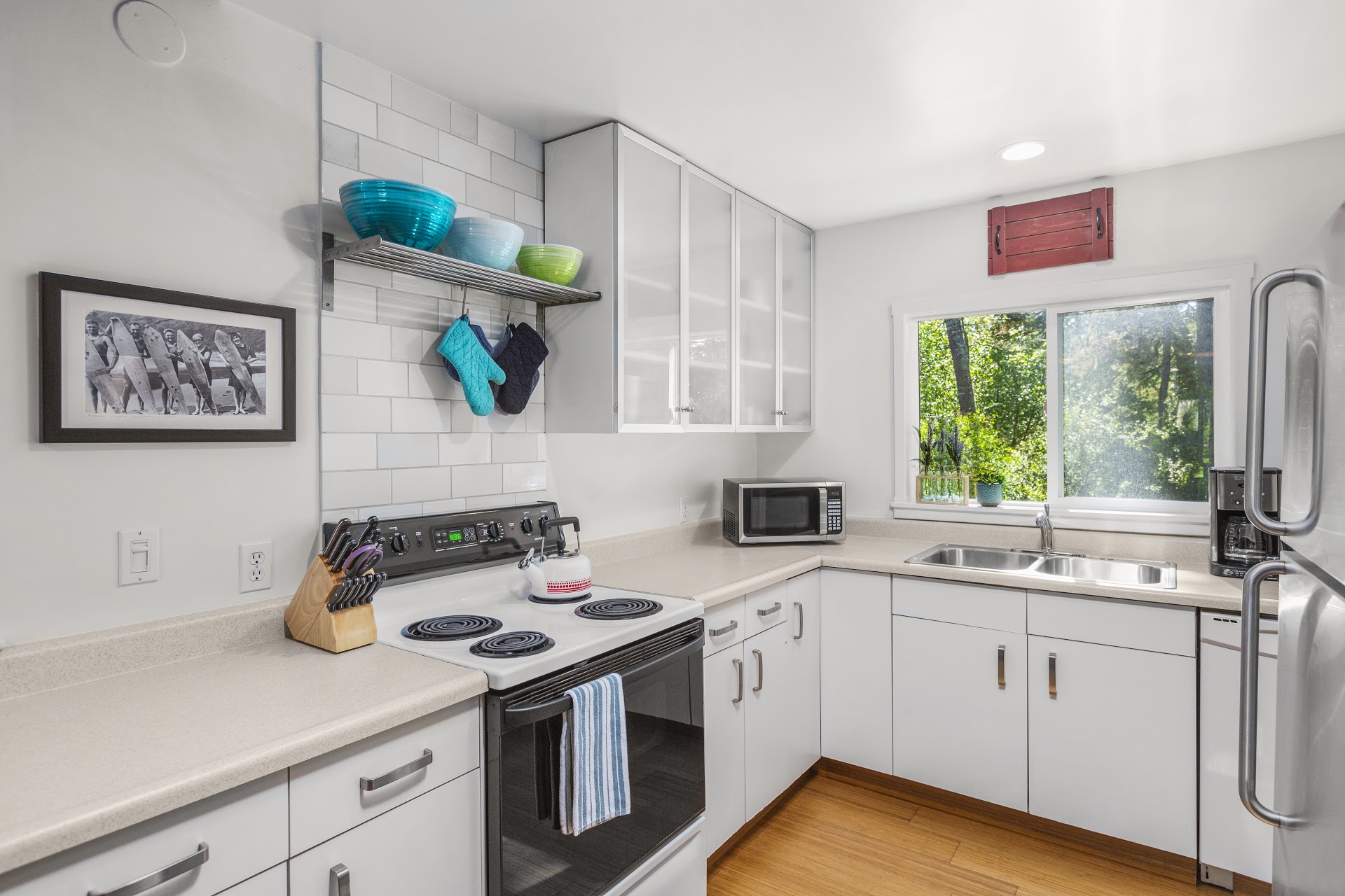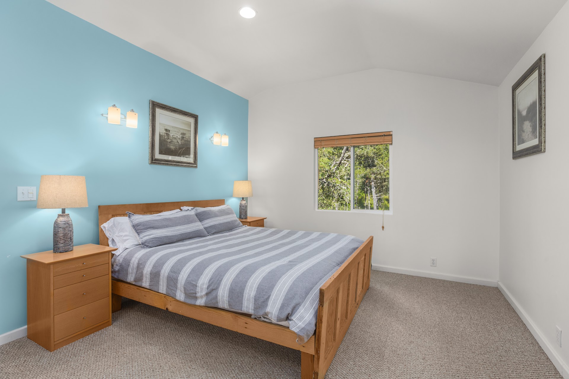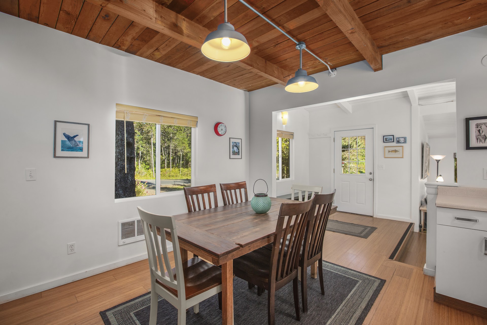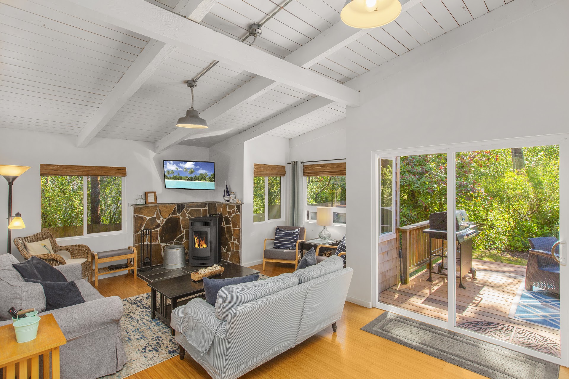 The main room is anchored by vaulted ceilings and a slider opening to the back deck. The backyard is surrounded by