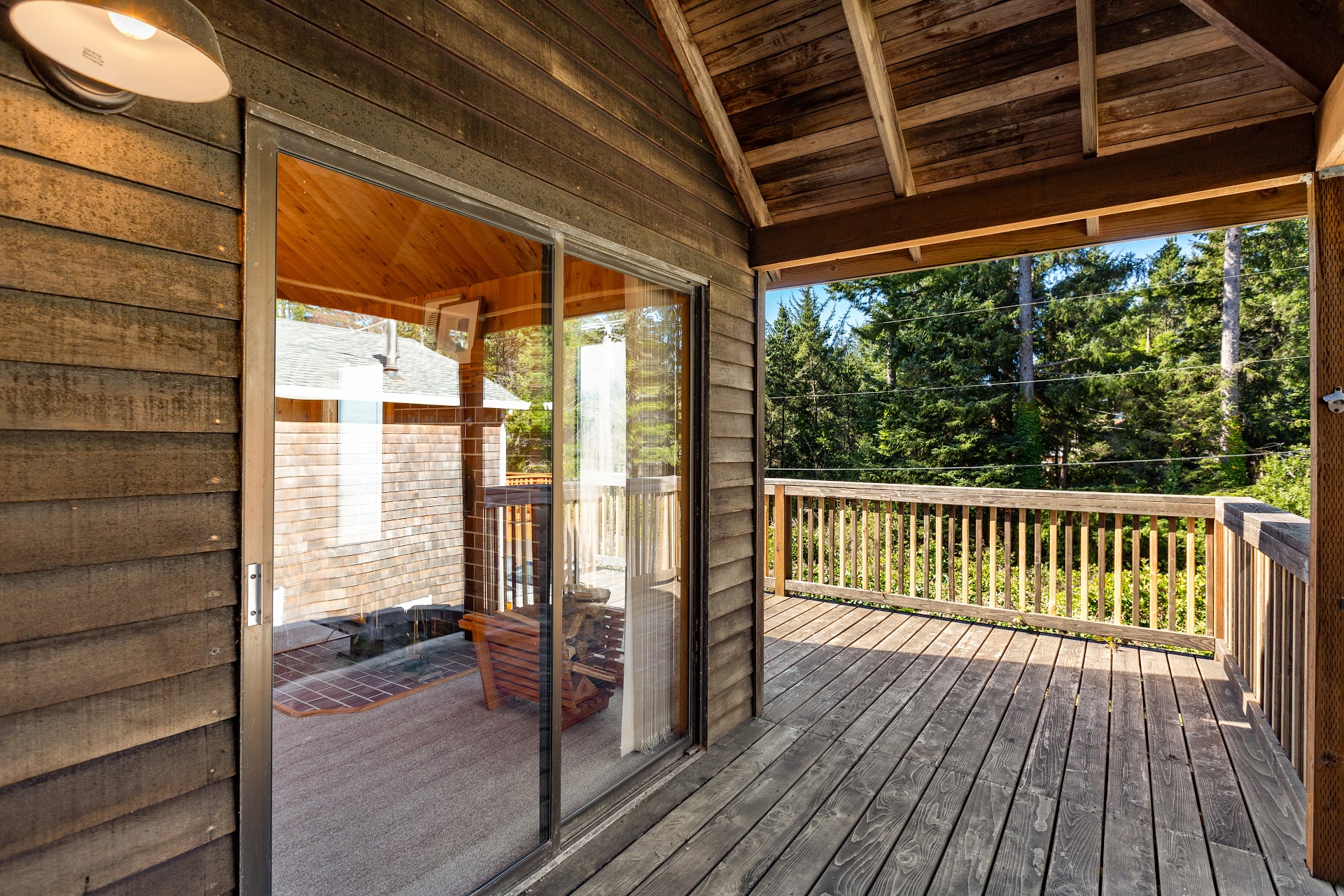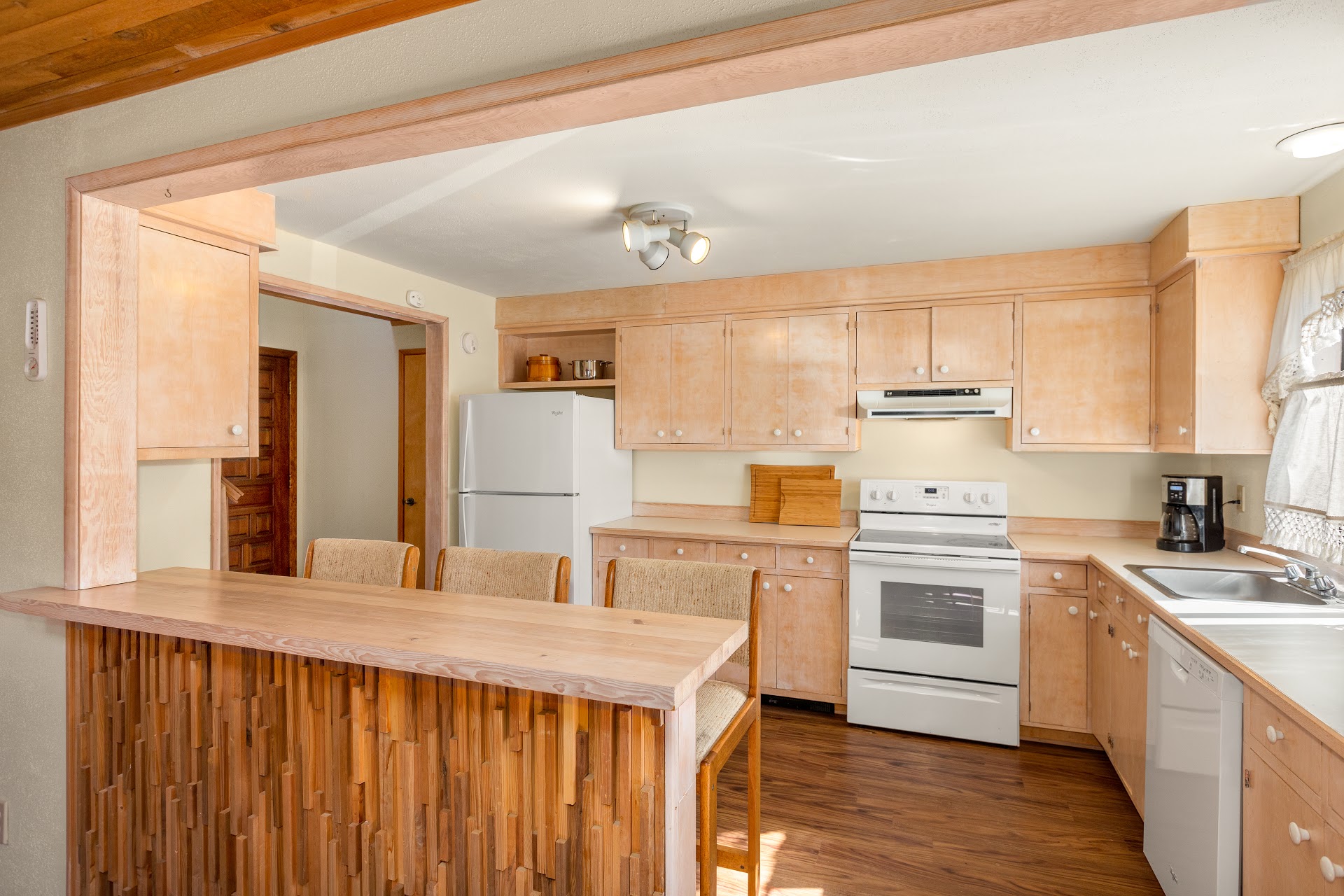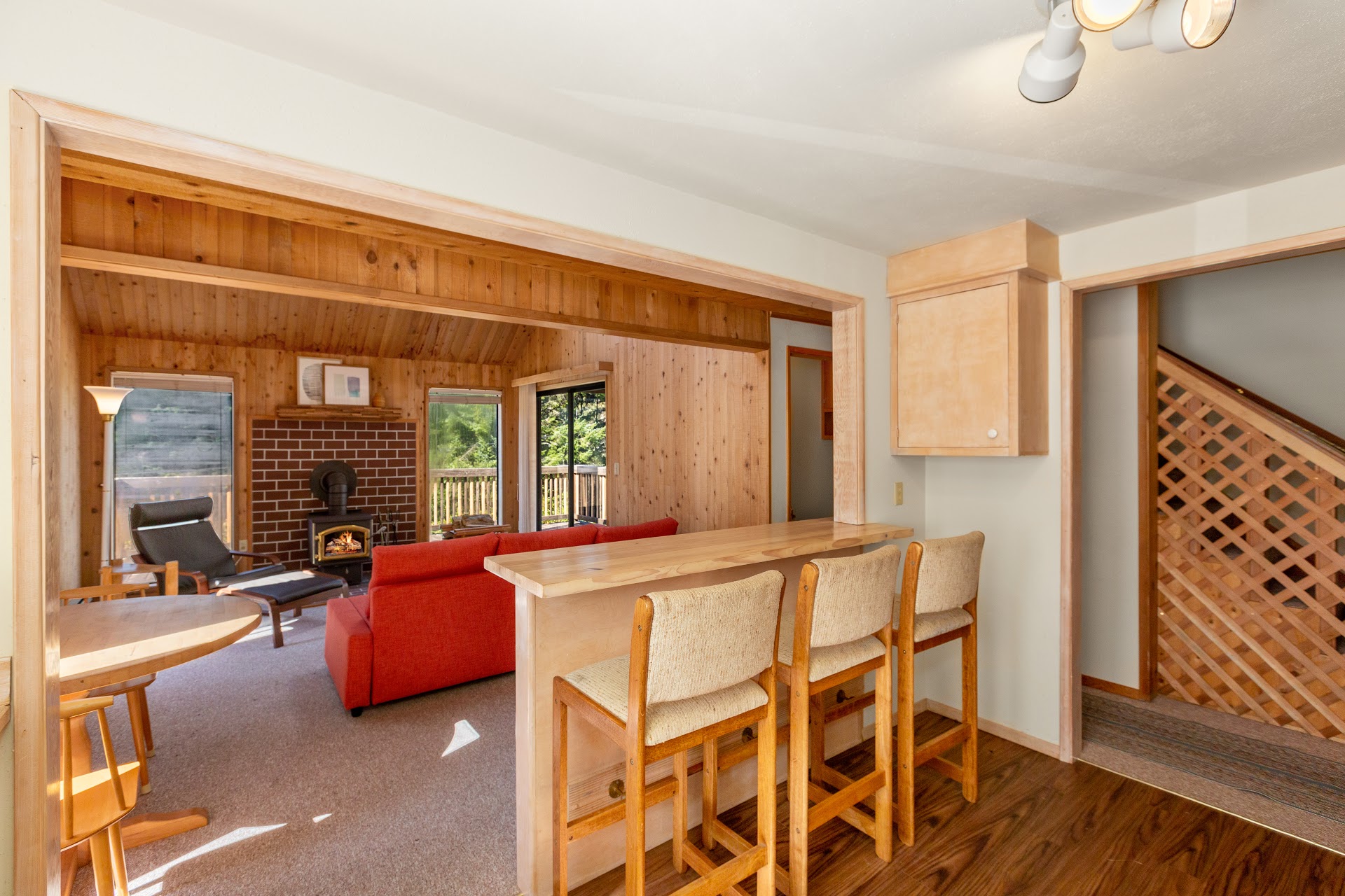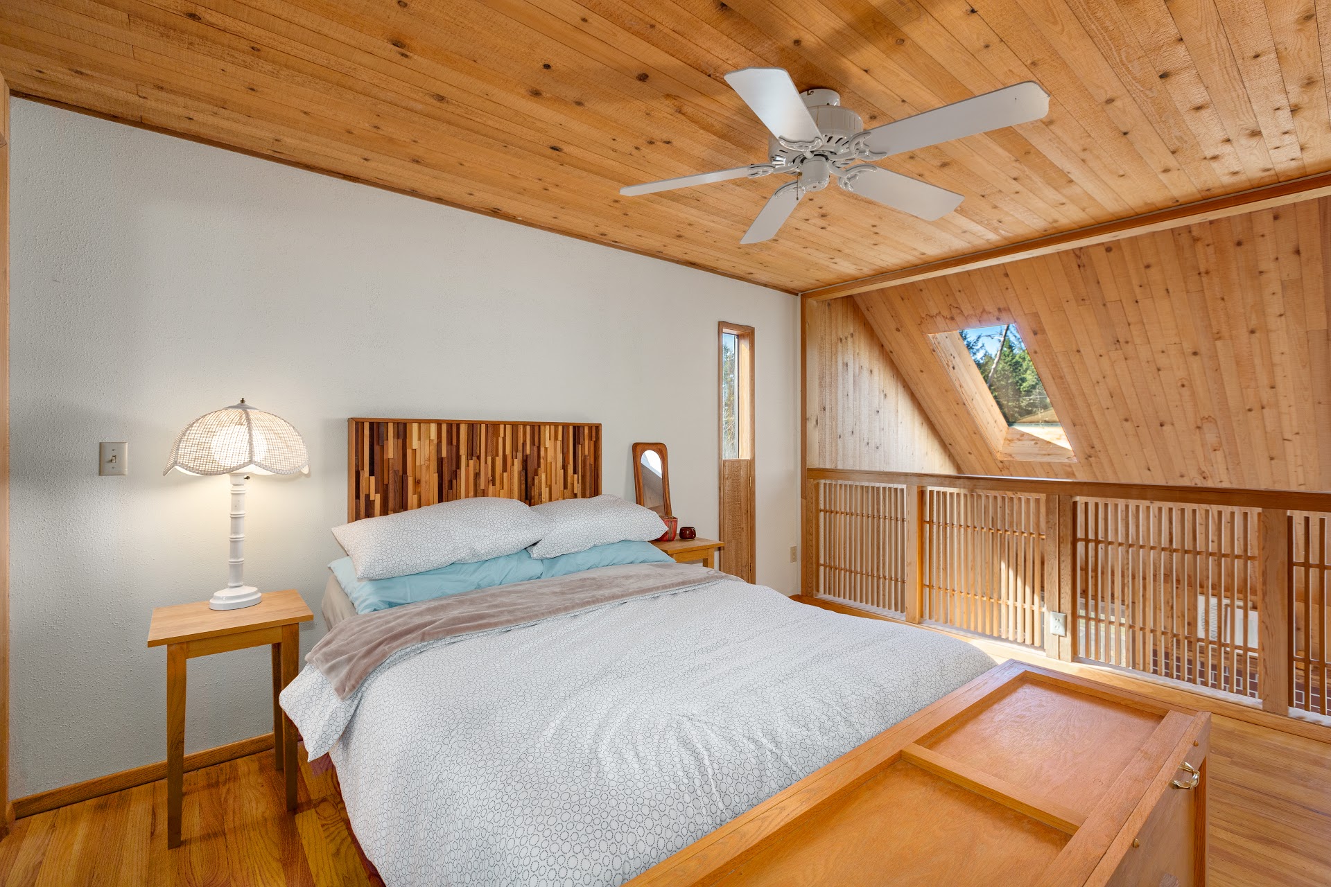 Tucked into an elevated bluff & surrounded by greenery, the 1,050 sq ft home features 1 bedroom + loft and 1 1/2 bathrooms in an open floor plan. A beautiful wooden door offers a stately welcome. Skylights and well-placed windows bathe the interior with natural light, and front deck creates outdoor connection. Throughout the years, the home’s handcrafted details were added to include intricate wood detailing on the front of the kitchen bar.